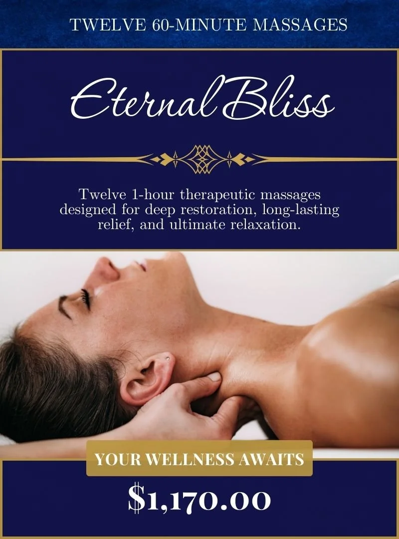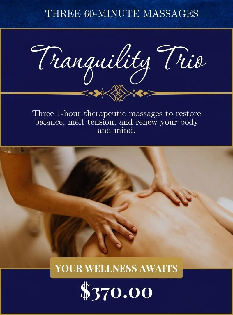 1 Hour Massages Categories: Select a Category 1 Hour Massages 90 Minute Massages Tranquility Trio $370.00 Add to Cart Added! Serenity Six $700.00 Add To Cart Added! Eternal Bliss $1,170.00 Add To Cart Added!